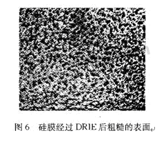 反應(yīng)離子深刻蝕(DRIE)能刻出非常深的垂直結(jié)構(gòu),本試驗用于最后硅薄膜的形成。DRIE的刻蝕效果(刻深為250 μm)沒有KOH腐蝕的平坦,刻蝕表面比較粗糙,表面顆粒起伏為幾個微米,如圖6。此外刻蝕存在不均勻性,75 mm硅片四周已經(jīng)刻到電極露出,而硅片中央的電極還沒有露出。深刻蝕的不均勻性與刻蝕表面的圖形有著密切的聯(lián)系,但其中的成因和機理目前還沒有具體合理的理論和解釋說明。因而無法從理論上指導(dǎo)規(guī)劃刻蝕表面的形狀設(shè)計,更多的是依靠經(jīng)驗手動凋整。