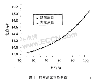 在室溫19.34℃的條件下,對壓力傳感器進行測量。測量設(shè)備為Druck的DPI610IS,測量電路采用了AD公司的AD7745電容測量芯片,精度能達到4 fF。測量曲線如圖7所示,測試精度為8.1‰。由于硅薄膜較厚,測量范圍內(nèi)的線性部分不多,此外電容電極的面積利用率不高使得電容的變化量也小,這些都是造成性能不高的主要原因,但由圖可以看出測量曲線存在很好的一致性和重復(fù)性。