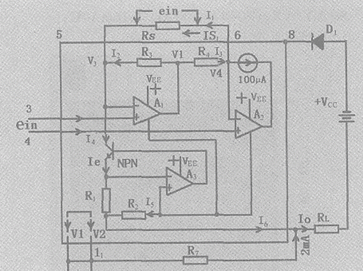 Rs為增益調(diào)節(jié)電阻,調(diào)節(jié)Rs可使輸入電壓ein在從最小值變到最大值時使輸出電流Io從4mA變到20mA。即△I=16mA的輸出電流。需要注意的是:為使Io不超過20mA,當Rs=∞時,ein不應超過1V,而當Rs減小時,ein也應相應減小。