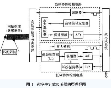 設(shè)計的微變電容式傳感器的原理框圖如圖1 所示。該傳感器由同軸電纜、高低頻信號分離電路、高頻特性檢測電路、低頻特性檢測電路和嵌入式系統(tǒng)等組成。高頻特性檢測電路監(jiān)測同軸電纜特性阻抗的變化, 而低頻特性監(jiān)測電路則監(jiān)測同軸電纜分布電容的變化, 兩電路相互補充完成對同軸電纜的局部變形的監(jiān)測和定位。
