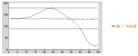 從圖1和圖2中可以看出,兩條黑線之間的數(shù)據(jù)很難斷定是哪個(gè)動(dòng)作產(chǎn)生的,因?yàn)閮蓚€(gè)動(dòng)作都可能產(chǎn)生這樣的值。所以,利用黑線之外的數(shù)據(jù)來判定是向右還是向左搖。因?yàn)閷τ谶@兩個(gè)動(dòng)作,黑線之外的數(shù)據(jù)有明顯的差異,數(shù)據(jù)相差很多。對于圖1這些數(shù)據(jù)大于150,圖2中這些數(shù)據(jù)小于90。因此這些數(shù)據(jù)至少相差60,可以很容易地將向左、向右的兩個(gè)動(dòng)作區(qū)分開。