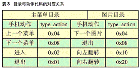 仿真器的外觀和操作類似一部移動(dòng)電話,但是并不代表某個(gè)特定的設(shè)備,而是提供對其所支持的API 的正確實(shí)現(xiàn),每個(gè)命令按鈕對應(yīng)著相應(yīng)的API函數(shù)。從圖6中可以看到手機(jī)的導(dǎo)航鍵,我們更改了導(dǎo)航鍵的API函數(shù),使其從鼠標(biāo)單擊觸發(fā)的方式轉(zhuǎn)換為串口動(dòng)作代碼控制。首先,我們編寫了J2ME的串口接收程序,用于接收從單片機(jī)傳來的單字節(jié)的type_action值;然后將type_action以參數(shù)的形式傳給API,手機(jī)根據(jù)不同的type_action值執(zhí)行不同的動(dòng)作,包括菜單上下翻、進(jìn)出二級子菜單、圖片翻轉(zhuǎn)等。手機(jī)動(dòng)作與type_action的對應(yīng)關(guān)系如表3。