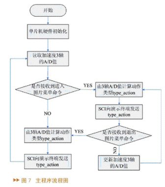 當(dāng)單片機(jī)檢測到某個(gè)動(dòng)作時(shí)會(huì)將相應(yīng)的值賦給變量type_action,之后通過SCI將type_action的值發(fā)送到演示終端。如果用戶執(zhí)行的動(dòng)作不在這六個(gè)動(dòng)作之中,則將NO_ACTION賦給type_action,表示演示終端不執(zhí)行任何動(dòng)作。
