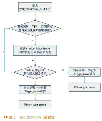 動(dòng)作檢測主要是用獲得的三組數(shù)據(jù)值x_data[N]、y_data[N]、z_data[N]來判定當(dāng)前動(dòng)作是系統(tǒng)設(shè)定動(dòng)作中的哪一個(gè),如果符合,則發(fā)送這個(gè)動(dòng)作對應(yīng)的預(yù)定義值給演示終端,否則發(fā)送NO_ACTION。type_dectction()用來實(shí)現(xiàn)動(dòng)作檢測,其中type_move為函數(shù)內(nèi)部變量,用于記錄動(dòng)作代碼。type_dectction()進(jìn)行動(dòng)作檢測的流程如圖8所示。