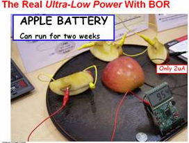 低功耗:便攜化就意味著產(chǎn)品將對(duì)待機(jī)時(shí)間提出更多需求。在CMET2009上,來自TI的 MSP430微控制器業(yè)務(wù)發(fā)展經(jīng)歷刁勇展示了MSP430家族令人吃驚的功耗特征:僅僅用三小塊蘋果制成的生物電池就可以帶動(dòng)MSP430正常工作一到兩個(gè)星期!