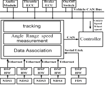 數(shù)據(jù)融合系統(tǒng)采用分布式體系結(jié)構(gòu),即每個(gè)近距離傳感器對(duì)獲得的回波信號(hào)先進(jìn)行局部處理,然后送入融合中心進(jìn)行融合以獲得目標(biāo)的方位、速度信息??刂破魇钦麄€(gè)雷達(dá)網(wǎng)絡(luò)系統(tǒng)的最終決策機(jī)構(gòu),它負(fù)責(zé)識(shí)別目標(biāo)的距離和速度信息是否對(duì)行車安全構(gòu)成威脅,并通過(guò)聲光的形式提示駕駛員或者直接作用于車載控制系統(tǒng)加以調(diào)整。