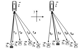 對(duì)于本文所討論的雷達(dá)網(wǎng)絡(luò)系統(tǒng)而言,四個(gè)近距離雷達(dá)傳感器即是發(fā)射機(jī)又是接收機(jī)。如圖6所示,通過(guò)電掃開關(guān)的控制,其中的一個(gè)NDS擔(dān)當(dāng)發(fā)射機(jī),反射信號(hào)被四個(gè)NDS同時(shí)接收。經(jīng)過(guò)信號(hào)處理之后,因各個(gè)NDS之間位置的不同,可以得到四組關(guān)于被測(cè)目標(biāo)的距離和相對(duì)速度值(r1,1v1,1)、(r1,2v1,2)、(r1,3v1,3)、(r1,4v1,4)。這種采用單基地發(fā)射多基地接收的雷達(dá)網(wǎng)絡(luò)體制,盡管對(duì)傳感器之間的時(shí)間同步控制要求很高,但是可以避免鄰近傳感器之間的相互干擾。