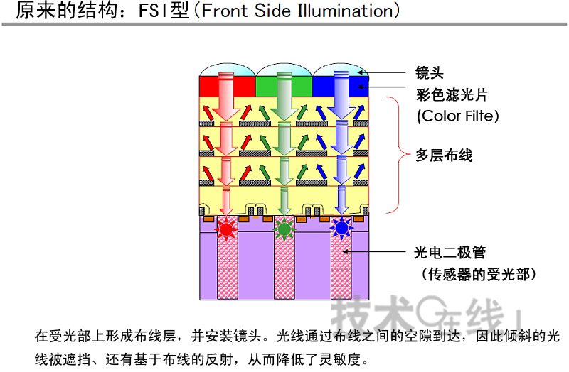 在BSI型CMOS傳感器中,可通過采用傳感器上面沒有布線層的結(jié)構(gòu)來提高采光率。研磨形成傳感器的硅底板,然后將鏡頭靠近傳感器安裝。此項(xiàng)工序采用了晶圓薄化和接合等大量面向MEMS使用的工藝技術(shù)。由于沒有妨礙光線入射的布線層,因此可提高靈敏度。東芝表示,若是已宣布量產(chǎn)的1.4μm產(chǎn)品,則可將靈敏度提高約40%。另外,該元件的光學(xué)格式為1/2.3英寸,幀速率為60幀/秒(支持1080p以及720p)。
