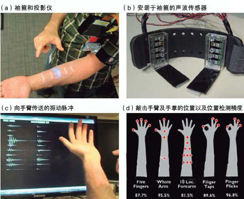 Harrison與美國微軟研究院(Microsoft Research)的研究人員開發(fā)出了以手及手臂表面作為觸摸面板的技術(shù)“Skinput”。“我們試制了一個可實(shí)際運(yùn)行的系統(tǒng)”(Harrison)。只需用手指在手掌及手臂等的表面輕輕敲擊,即可操作游戲機(jī)、音樂播放器及手機(jī)等。