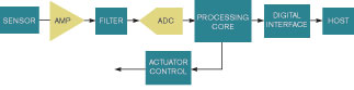 傳感器的模擬信號(hào)必須經(jīng)過數(shù)字化才能供系統(tǒng)使用,并且信號(hào)要經(jīng)過放大、濾波和數(shù)字化(圖1)。每一級(jí)通常都涉及一只圍繞著一些無源元件的器件,以正確地實(shí)現(xiàn)一個(gè)應(yīng)用。一旦對(duì)信號(hào)做了數(shù)字化,就可以將其送給微處理器上的控制系統(tǒng),或整理數(shù)據(jù)后通過一個(gè)通信協(xié)議送至一只主處理器。協(xié)議可以根據(jù)需要使用傳感器數(shù)據(jù)。