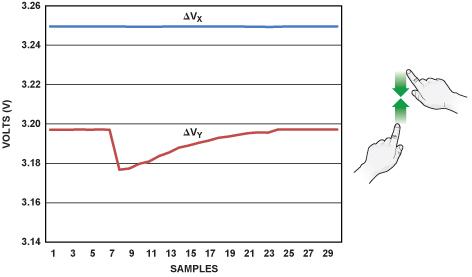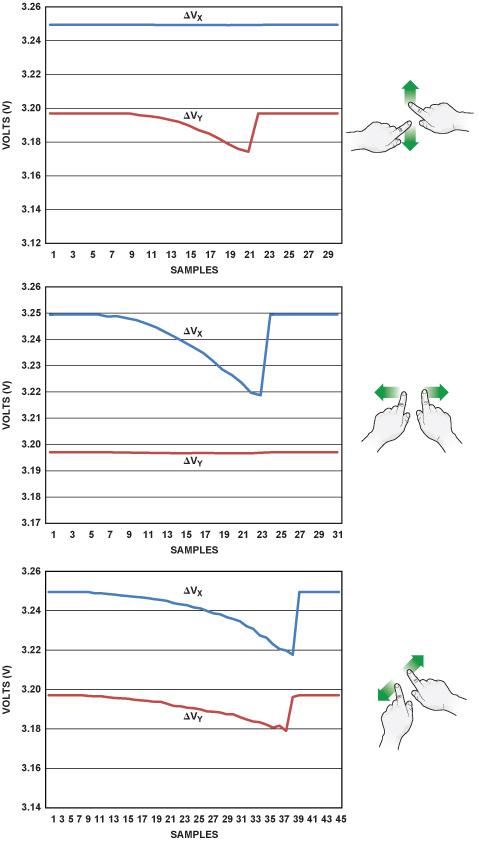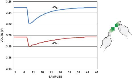 圖 3 顯示了一個(gè)沿著垂直(Y)軸捏合的例子。當(dāng)手勢(shì)開(kāi)始時(shí),其中一層的兩根電極之間的電壓恒定不變,另一層則表現(xiàn)出階躍性降低,然后隨著手指相互靠近而提高。
