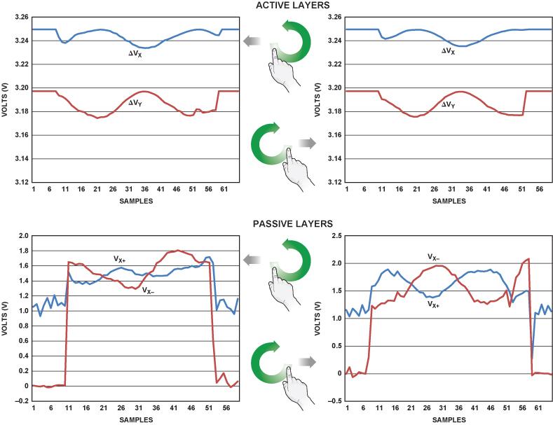 在后半周期中,將一個(gè)直流電壓施加于下層(有源層),并測(cè)量Y+引腳的電壓(對(duì)應(yīng)于VX+ – VX–),以提供與X方向上的運(yùn)動(dòng)(接近還是分開(kāi))相關(guān)的信息。
