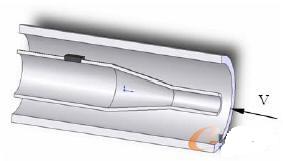 作者所在的研究組在前期應(yīng)用壓力梯度法和壓力互相關(guān)法測量液壓系統(tǒng)流量進(jìn)行了理論和實(shí)驗(yàn)研究,取得了一定進(jìn)展,在此基礎(chǔ)上,提出這種不需要引壓,直接讓 MEMS敏感芯體在管內(nèi)獲得與流量對應(yīng)的差壓信號(hào)的新方法。相比之下新方法在對系統(tǒng)較低擾動(dòng)的前提下更易獲得較高的信號(hào)水平,精度能滿足一般液壓系統(tǒng),具有高的動(dòng)態(tài)測量頻寬。其機(jī)理是利用內(nèi)置于管道中特殊設(shè)計(jì)的異徑結(jié)構(gòu)裝置,如圖1所示,對內(nèi)外流體分別產(chǎn)生收縮和擴(kuò)壓雙效作用,獲得低壓損、低能耗的微小壓力差,通過置于上面的MEMS敏感芯體測取,并根據(jù)建立的壓差-流量關(guān)系模型,及仿真手段和實(shí)驗(yàn)測試得出該狀態(tài)下的流量值。