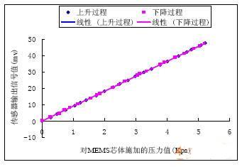 在進(jìn)行實(shí)驗(yàn)研究時(shí),選取了一種壓阻式MEMS微型壓差敏感芯體,在組裝傳感器之前,采用了FLUKE 718 10G型壓力校準(zhǔn)儀(Pressure Calibrator)對芯體進(jìn)行標(biāo)定。FLUKE 718 10G型壓力校準(zhǔn)儀通過其自帶的一個(gè)主氣泵和一個(gè)微調(diào)氣泵可以輸出穩(wěn)定的-12~30psi(-83~207KPa)氣壓,精度達(dá)到±0.05%滿量程。實(shí)驗(yàn)所用的MEMS芯體額定工作壓力量程為6KPa(安全工作壓力十倍于滿量程),在10.00+/-0.01V激勵(lì)電壓下,用FLUKE壓力校準(zhǔn)儀標(biāo)定結(jié)果如下: