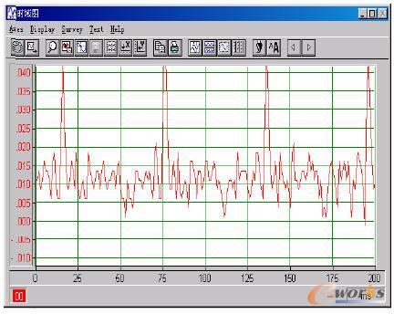 在動(dòng)態(tài)試驗(yàn)中,保持液壓泵提供20L/min的工作流量,使用Wavebook512信號(hào)系統(tǒng)對MEMS傳感器輸出流量信號(hào)進(jìn)行采集,如圖7所示。盡管受到系統(tǒng)內(nèi)閥口、管路等造成的干擾,而且由于柱塞泵各柱塞在制造、安裝以及使用中產(chǎn)生的誤差和磨損造成的不均勻現(xiàn)象,導(dǎo)致流量波動(dòng)曲線有些變形,但是還是可以很清晰的看出流量的波動(dòng)周期約為60ms,即頻率16.7Hz。由于電動(dòng)機(jī)工作在50Hz頻率,額定轉(zhuǎn)速1000r/min,因此相應(yīng)的軸向柱塞泵運(yùn)轉(zhuǎn)頻率也是1000/60=16.7Hz,這正與上面的測量結(jié)果吻合。