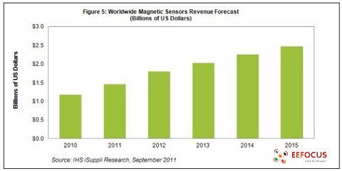 預(yù)計今年硅磁傳感器銷售額將達(dá)到14.6億美元。2010年該市場大增48.6%,達(dá)到11.8億美元。鑒于乘用車產(chǎn)業(yè)強(qiáng)勁復(fù)蘇,以及羅盤在手機(jī)和平板電腦中得到更多應(yīng)用,未來幾年磁傳感器市場前景相當(dāng)樂觀。