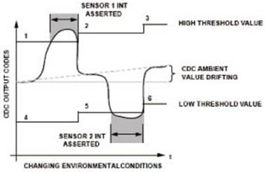 隨著環(huán)境條件的變化(例如,溫度或濕度上升),傳感器的環(huán)境參數(shù)(在用戶沒有與傳感器接觸期間,由CDC進(jìn)行測量)會發(fā)生漂移。為了進(jìn)行補償,需要動態(tài)改變高端和低端閾值電平,以確定有效的傳感器接觸。位置2、3、5、6處的參考電平進(jìn)行重新調(diào)整,以保持最佳的閾值參考電平,從而自動跟蹤和補償漂移誤差。