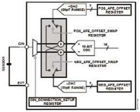 PCB還可能受到寄生電容的影響,這種電容最大可達(dá)20 pF,它會在電容觸摸傳感器視為受到按壓時,使閾值發(fā)生偏移,從而改變其靈敏度。為了對寄生電容進(jìn)行補償,可以采用對DAC編程的方法,以抵消CDC的輸入。對于各PCB來說,這種寄生電容是一致的,因此可以在制造PCB的時候進(jìn)行簡單的調(diào)整,這樣就不需要外部RC調(diào)諧元件,從而使材料、裝配和測試相關(guān)的成本最低。單獨調(diào)整每個傳感器的偏移,使設(shè)計者可以充分利用轉(zhuǎn)換器的分辨率(圖3)。