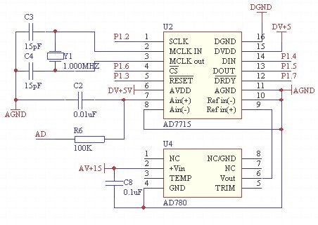 為了實(shí)現(xiàn)對微壓力的實(shí)時測量,使用 16 位的AD7715 對輸出電壓進(jìn)行采樣測量,其中AD780 提供2.5V 高精度基準(zhǔn)電壓。P3.1 腳提供了AD 工作所需的時鐘,P1.4 和P1.5 腳接收和發(fā)送通訊數(shù)據(jù),P1.6 是片選信號,P1.7 接DRDY ,AT89S52 可以通過查詢P1.7 的狀態(tài)來判斷是否可以讀取AD 轉(zhuǎn)換結(jié)果。A/D 接口電路如圖3所示。