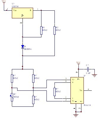 本文采用惠斯通電橋?yàn)V出微壓力傳感器輸出的模擬變量,然后用INA118放大器將此信號放大,用7715A/D 進(jìn)行模數(shù)轉(zhuǎn)換,將轉(zhuǎn)換完成的數(shù)字量經(jīng)單片機(jī)處理,最后由LCD 將其顯示,采用LM334 做的精密5 V 恒流源為電橋電路供電,完成了微壓力傳感器接口電路設(shè)計,既能保證檢測的實(shí)時性,也能提高測量精度。