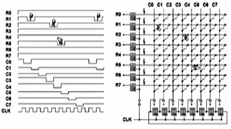 如圖8 所示,8×8 數(shù)字電阻觸摸屏, 基于Altera 解決方案[1]:它采用兩層ITO 分別作為水平的sensing line(觸摸感測線)和垂直的driving line(加電驅動線),driving line 和sensing line 之間的觸點就相當于一個開關,在未接觸時,它們之間是絕緣的,而接觸發(fā)生后,兩者發(fā)生短路,相當于開關閉合。驅動的時候,其中sensing line 通常由一個上拉電阻施加高電平,同時在driving line 上以一定頻率依次在各列中施加負脈沖電壓,這樣當掃描到觸點所在的那一列時,由于觸點開關閉合,形成直流通路,使得觸點所在行的電壓被拉低,形成一個負脈沖,這樣就檢測到了觸點的位置。由于driving line 是依次掃描,所以可以檢測到多個觸點的位置。