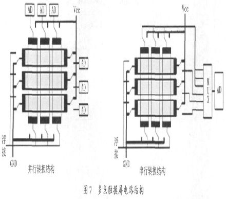 于是基本電路構架便可以分為串行和并行兩種,如圖7 所示。值得注意的是,圖6 僅表現(xiàn)了坐標采集轉換電路的基本原理和結構,并沒有畫出為減小各種電器噪聲而添加的元件,如AD 的下拉電阻、濾波電容等。