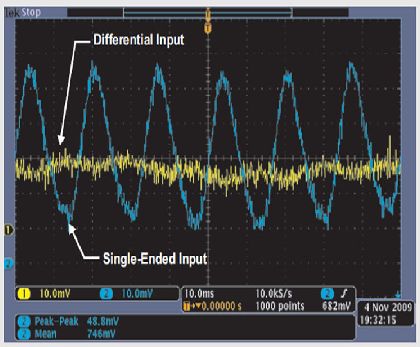 2、電荷放大器是一種非常敏感(高增益)的電路。圖17表明任何輸入干擾信號(hào)的電容耦合(此處為60Hz極板網(wǎng)柵)都會(huì)有效注入電流。就單端放大器而言,這意味著端子中的一個(gè)注入電流,而其他則接地;也就是說,放大器只會(huì)放大干擾信號(hào)。就差分輸入來說,施加于兩個(gè)端子的共模信號(hào)會(huì)相互抵消(假設(shè)寄生和反饋網(wǎng)絡(luò)相同)。圖18中,需要注意的是單端輸入(藍(lán)色軌跡)60Hz極板網(wǎng)柵的耦合結(jié)果,以及60Hz共模噪聲如何被干擾信號(hào)(黃色軌跡)相互抵消的差分輸入極大降低。本例中,為了方便理解,我們并沒有嘗試匹配超出10%組件容限的差動(dòng)輸入。