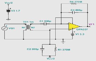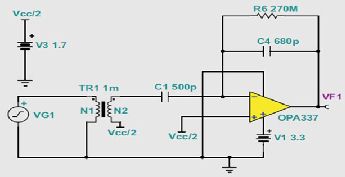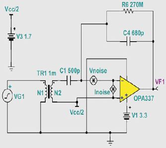 為了獲得更為實(shí)際的電路實(shí)施,我們選用了TI的OPA337.這款放大器擁有低輸入電壓和低輸入電流噪聲(請(qǐng)參見圖5),同時(shí)接受3V單極電源。圖6顯示了TI SPICE型仿真程序中這種電路的模型,即TINA-TI.