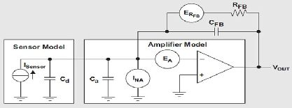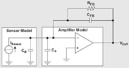 信號(hào)調(diào)節(jié)電路必須具有非低的輸入阻抗,以收集傳感器的大部分電荷輸出。因此,電荷放大器是理想的解決方案,因?yàn)橹灰糯笃髟谶@些信號(hào)頻率下保持高增益,其輸入便會(huì)讓傳感器信號(hào)出現(xiàn)虛擬接地。換句話說,如果傳感器的任何電荷想要在傳感器陽極(Cd)或者放大器輸入寄生電容(Ca)上增大,在放大器輸入端就會(huì)形成電壓。通過拉或吸取相同量的負(fù)反饋網(wǎng)絡(luò)電荷電流,即RFB和CFB,這種電壓便立即得到了補(bǔ)償。