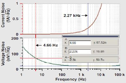 在第一項(xiàng)中,如果INA≈0.3 fA/√HZ ,且RFB = 270MΩ,則該項(xiàng)對(duì)輸出噪聲的貢獻(xiàn)值約為80 nV/√HZ /5.85=14nV/ √HZ .