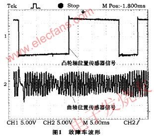 故障分析與測試采用雙蹤示波器同時測量故障車上曲軸位置傳感器與凸輪軸位置傳感器的波形如圖1所示,在同類型的正常車上測得的凸輪軸位置傳感器和曲軸位置傳感器波形如圖2所示。