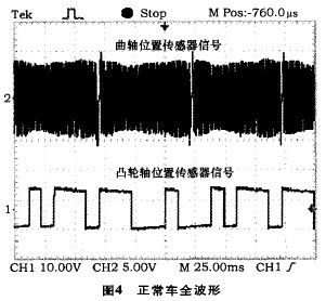通過圖4還能看出曲軸位置傳感器波形出現(xiàn)2次才與凸輪軸位置傳感器波形重合一次起始位置,這種關(guān)系和本車曲軸轉(zhuǎn)速與凸輪軸轉(zhuǎn)速比為2:1的關(guān)系一致,也正好是1缸上止點的位置,也就是1缸點火正時的基準位置,也決定了其它3個缸的點火時刻。此信號傳輸給腳,ECU就能發(fā)出點火信號,起動發(fā)動機。否則ECU就不發(fā)出點火信號,發(fā)動機不能起動。