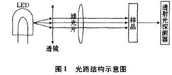 系統(tǒng)要求光電傳感探測(cè)部分具有較高的檢測(cè)精度和穩(wěn)定性,且實(shí)時(shí)性高,即需要對(duì)待測(cè)海水進(jìn)行連續(xù)不間斷的在線測(cè)量,因此采用近紅外LED作為光源。光源發(fā)出的近紅外光經(jīng)過光學(xué)鏡組選擇得到對(duì)溢油具有特征吸收的分析光,經(jīng)透射與樣品室的樣品發(fā)生相互作用,然后進(jìn)入光電探測(cè)器,將光信號(hào)轉(zhuǎn)換為電信號(hào),從而實(shí)現(xiàn)對(duì)樣品成分的檢測(cè)見圖1所示。