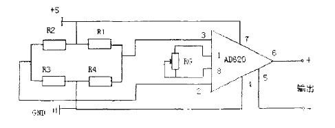 我們選用的高精度低噪聲儀用放大器AD620,可以用在傳感器輸出信號小的放大器中,如光電池傳感器、應(yīng)變片傳感器以及壓力傳感器等。由于它具有低噪聲、增益精度高、增益溫度系數(shù)小和高線性度等優(yōu)良性能。用于此系統(tǒng)中是非常理想的。AD620是一種只用一個外部電阻就能設(shè)置放大倍數(shù)為1-1000的儀表放大器,具有良好的直流性能和交流性能,AD620的體積小、功耗低成為應(yīng)用在壓力傳感器中的重要因素,傳感器信號放大電路如圖5所示。