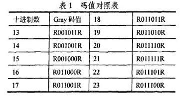 編碼采用格雷碼(Gray)為數(shù)值碼,以某一固定碼寬為參考碼R,它用于標(biāo)尺定位和提高精度。Gray碼是一種絕對編碼方式的無權(quán)碼,它所具有的循環(huán)、單步特性能消除隨機(jī)取數(shù)時出現(xiàn)重大誤差的可能,其任意兩個柏鄰整數(shù)之間轉(zhuǎn)換時,只有一個位數(shù)發(fā)生變化,大大減少了由一個狀態(tài)轉(zhuǎn)到下一個狀態(tài)時的邏輯混淆,具有較強(qiáng)的容錯能力。以6位編碼為例,其部分十進(jìn)制數(shù)與Gray碼的一一對應(yīng)關(guān)系如表1所示。