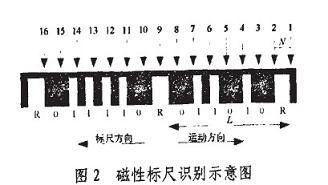 根據(jù)磁敏傳感原理,“凹槽”和“凸槽“會導(dǎo)致不同的磁場強(qiáng)度,從而使磁敏元件相應(yīng)地輸出不同的電半信號“0”或“1”,形成數(shù)值碼,用于確定位移的粗讀值;而標(biāo)志位R碼寬兩倍于碼元“1”寬度的特點,使得識別后的序列出現(xiàn)具有固定特征的標(biāo)識碼,它用于精讀數(shù)。