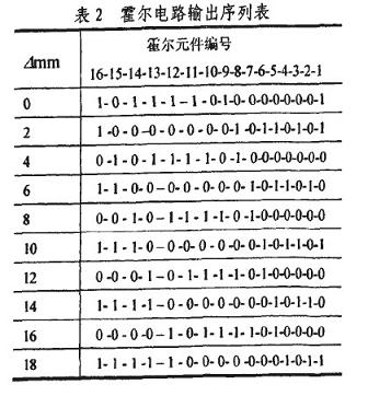 霍爾電路的工作原理是,在外磁場的作用下,當(dāng)磁感應(yīng)強(qiáng)度B超過導(dǎo)通工作點時,霍爾電路輸出管導(dǎo)通,輸出低電-半:若曰值低于釋放點時,輸出管截止,輸出高電半。因此在“凸槽”時鋼質(zhì)活塞桿被磁化,磁感應(yīng)強(qiáng)度曰增加,霍爾電路導(dǎo)通,輸出低電平,用“1”表示;在“凹槽”時輸出高電平,用“0”表示。以第1個霍爾元件為測量基準(zhǔn),從圖2所示時刻起,位移暈旃次變化b=2mm時,一個碼區(qū)行程內(nèi)霍爾電路輸出的二進(jìn)制序列如表2所示。分析可知,序列的標(biāo)識碼為l 0000000 1,其前面或后面6位序列數(shù)分別為相鄰的兩個數(shù)值碼,這使它具有很強(qiáng)的容錯能力。標(biāo)識碼每隔一個霍爾元件間距N在低位部分右移一位。值得注意的是,標(biāo)識碼前面的數(shù)值碼代表磁性標(biāo)尺當(dāng)前檢測位置下一個碼區(qū)的值。