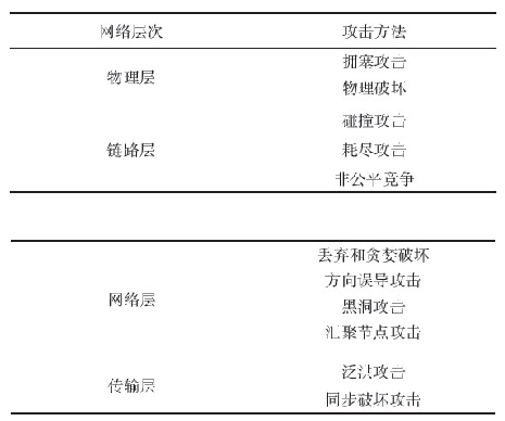 無線傳感器網(wǎng)絡(luò)(WSN)易受各種安全威脅,許多文獻勻有描述。文獻將WSN的攻擊按照不同層次分類,如表1所示。
