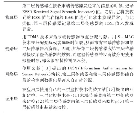 修改了Da Silva等人提出的入侵檢測算法,并將它運用在第二和第三層傳感器上。由于傳感器資源有限,沒有在任何末端傳感器上運用IDS.監(jiān)控節(jié)點的功能被分成三個階段。第一階段:所有的末端傳感器從它們周圍環(huán)境收集數(shù)據(jù),然后報告給第二層傳感器。第二階段:用基于分層的攻擊檢測方法來檢測文獻提出的攻擊類型。表2描述了攻擊在各層中如何被發(fā)現(xiàn)的。這種基于分層的攻擊檢測方法使得系統(tǒng)更完善。第三階段:比較每個上報的結(jié)果來定義閾值,以此來決定是否要發(fā)出一個報警。第三階段常??梢詼p少錯報率。閾值可以人工定義或者根據(jù)特定的WSN需求來調(diào)整。因此,提出的入侵檢測體系結(jié)構(gòu)通過減少錯報能夠檢測到大多數(shù)的安全威脅。