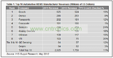 據(jù)IHS iSuppli公司的汽車MEMS報(bào)告,德國博世2011年是全球最大的汽車MEMS器件生產(chǎn)商,憑借自己的優(yōu)勢(shì)地位和高于產(chǎn)業(yè)平均水平的增長速度,其營業(yè)收入實(shí)現(xiàn)增長。