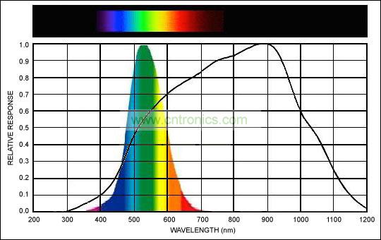 這里還存在一個(gè)更細(xì)微的問(wèn)題。具體而言,理想情況下,應(yīng)確保環(huán)境光的測(cè)量模擬了人眼對(duì)光線的響應(yīng)機(jī)制。這通常借助CIE提供的視覺(jué)亮度曲線(圖3)。然而,光電二極管很少能夠完全模擬這種響應(yīng)機(jī)制,因?yàn)樗鼈兺ǔ>哂泻芨叩募t外(IR)靈敏度。在IR強(qiáng)度較大的光照條件(譬如白熾燈或日光)下,這種紅外靈敏度會(huì)造成錯(cuò)誤地判斷光線強(qiáng)度。