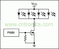 許多顯示屏模塊如今都配有一個(gè)集成控制器,用戶可以通過(guò)向控制器發(fā)送串行命令,直接設(shè)置背光亮度。如果顯示屏模塊未配備集成控制器,還可安裝一個(gè)簡(jiǎn)單的背光控制執(zhí)行器,控制顯示屏后面用于背光照明的白光LED燈的輸入電流。實(shí)現(xiàn)這種控制的一種簡(jiǎn)單辦法是:直接給LED串聯(lián)一個(gè)場(chǎng)效應(yīng)晶體管(FET),使用PWM信號(hào)快速打開(kāi)、關(guān)閉FET (圖5)。然而,也可以利用單一芯片(用于LED控制的MAX1698升壓轉(zhuǎn)換器)準(zhǔn)確、可靠地調(diào)節(jié)(圖6),請(qǐng)參考應(yīng)用筆記3866“Low-power PWM output controls LED brightness”,獲取詳細(xì)信息。