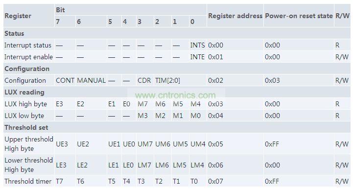 當(dāng)光積分時間為100ms的倍數(shù)(如:100/200/400/800ms)時,這些環(huán)境光傳感器能夠很好地抑制50Hz/60Hz噪聲干擾。然而,多數(shù)情況下,很多應(yīng)用需要一個轉(zhuǎn)換完成信號,在可靠讀取環(huán)境光傳感器信息時避免不必要的延遲。本應(yīng)用筆記主要介紹如何使用器件的中斷引腳提供轉(zhuǎn)換完成指示,詳細(xì)說明I²C寄存器的設(shè)置方法。