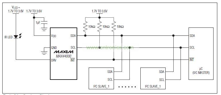 MAX44000設(shè)計(jì)用于驅(qū)動(dòng)外部IR LED,工作在1.7V至3.6V VDD供電電源。只有環(huán)境光傳感器工作時(shí),器件消耗5µA電流,使能接近檢測(cè)接收器和驅(qū)動(dòng)器后,器件僅消耗7µA電流。