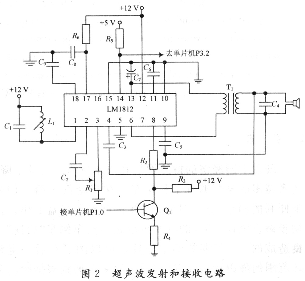 系統(tǒng)框圖如圖1所示。該系統(tǒng)由單片機(jī)控制電路、超聲波發(fā)射與接收電路、溫度補(bǔ)償電路、LCD顯示電路以及語(yǔ)音報(bào)警電路等幾部分組成。單片機(jī)AT89C51是整個(gè)系統(tǒng)的核心部件,協(xié)調(diào)各部分電路的工作。單片機(jī)在超聲波信號(hào)發(fā)射的同時(shí)開(kāi)始計(jì)時(shí),超聲波信號(hào)在空氣中傳播遇到障礙物后發(fā)生反射,反射的回波信號(hào)經(jīng)過(guò)處理后輸入到單片機(jī)的INTO端產(chǎn)生中斷,計(jì)數(shù)器停止計(jì)數(shù)。通過(guò)計(jì)數(shù)器測(cè)得的脈沖數(shù)可得到超聲波信號(hào)往返所需要的時(shí)間,從而達(dá)到測(cè)距的目的。超聲波探頭選用TCF40-25TR1型收發(fā)一體式超聲波傳感器,諧振頻率為40 kHz;超聲發(fā)射與接收電路采用LM1812專業(yè)集成電路,不僅外圍元件較少,電路簡(jiǎn)單,而且有更好的穩(wěn)定性及可靠性;溫度補(bǔ)償電路采用一線制數(shù)字溫度傳感器DS18B20,利用聲速和溫度之間的關(guān)系對(duì)聲速進(jìn)行校正,從而消除溫度對(duì)聲速的影響;語(yǔ)音報(bào)警電路采用ISD4004,可實(shí)現(xiàn)汽車倒車過(guò)程中的語(yǔ)音報(bào)警。