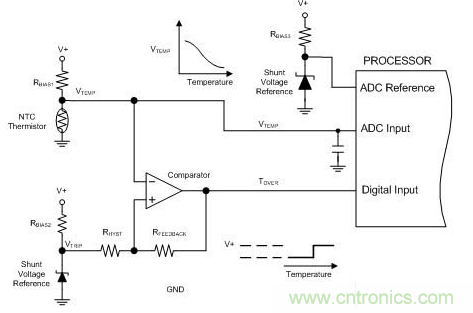 處理器的模數(shù)轉(zhuǎn)換器用于采集溫度模擬電壓(VteMP)。當溫度超出臨界值時,數(shù)字比較器的輸出端會驅(qū)動處理器的輸入端進行提示。