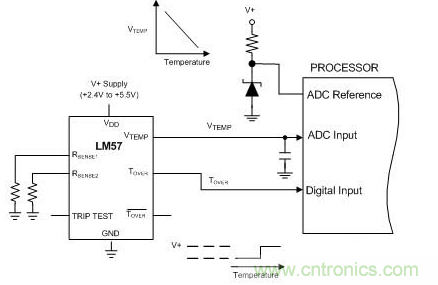 處理器的模數(shù)轉(zhuǎn)換器用于采集溫度模擬電壓(VTEMP)。當溫度超出臨界值時,過熱(TOVER)輸出端會驅(qū)動處理器的輸入端進行指示。跳脫點由兩個無源電阻器(RSENSE1和RSENSE2)設(shè)置,而不是由有效參考端和偏壓電阻器設(shè)置。