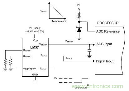LM57完全集成(圖3),所有組成部分的輸入輸出都包含在LM57的校對流程中,因此不會產(chǎn)生以上所提到的誤差源。同時,系統(tǒng)設(shè)計員不需要累加各組成元件的誤差,從而得出總誤差。LM57能保證VTEMP模擬輸出的最大誤差為±0.7℃,TOVER警報輸出的最大誤差為±1.5℃。