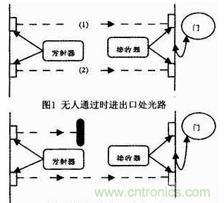 本設(shè)計(jì)的改進(jìn)之處是設(shè)計(jì)一個(gè)具有計(jì)數(shù)功能的模塊,我們可以使用對射型光電傳感器,如圖1所示在洗手間的進(jìn)口處設(shè)置兩個(gè)發(fā)射源和兩個(gè)接收源,當(dāng)有人進(jìn)或者出洗手問的門時(shí),會(huì)阻擋光線,如圖2所示,接收處就接收不到設(shè)置光源發(fā)出的光信號(hào),這時(shí)接收處的輸出端會(huì)發(fā)出一個(gè)信號(hào),計(jì)數(shù)器就可以通過此信號(hào)進(jìn)行計(jì)數(shù)。只要計(jì)數(shù)器里存儲(chǔ)數(shù)等于一時(shí),系統(tǒng)控制燈亮,大于零時(shí),該系統(tǒng)就會(huì)控制燈一直亮著,一旦為零,系統(tǒng)會(huì)控制燈延時(shí)一小段時(shí)間后自動(dòng)熄滅。由于整個(gè)系統(tǒng)初啟動(dòng)時(shí)無法判斷室內(nèi)是否有人,因而我們還會(huì)設(shè)置一個(gè)簡易開關(guān),供使用者進(jìn)行手控,且為方便使用者能在夜間看到開關(guān)的位置,我們可以采用表面具有夜光性能的材料來做按鍵。光電檢測系統(tǒng)的啟動(dòng)由光敏傳感器控制。