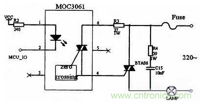 本系統(tǒng)由光電傳感器檢測洗手間內(nèi)是否有人,單片機(jī)進(jìn)行計(jì)數(shù),當(dāng)N不為零時(shí),單片機(jī)會(huì)向與MOC3061芯片引腳相連的端口輸送信號(hào),然后通過可控硅來控制燈的開、關(guān)。其中R3是雙向可控硅的門極電阻,當(dāng)可控硅靈敏度較高時(shí),門極阻抗也很高,并上R3可提高抗干擾能力。 39Ω電阻和0.01μF電容組成浪涌吸收電路,防止浪涌電壓損壞雙向可控硅。其電路圖如圖4所示。